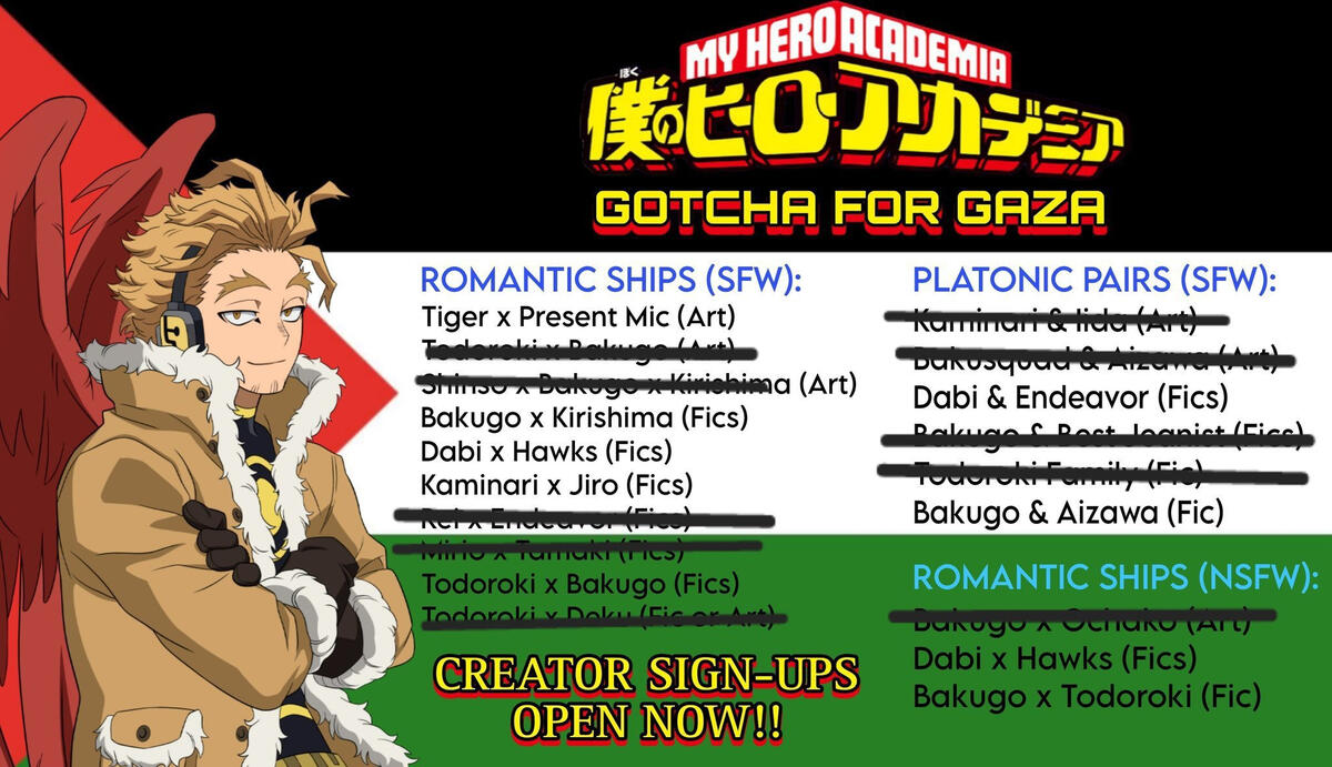 The goal of this fundraiser is for fans and creators in the MHA fandom to help fundraise for charities that are currently aiding the following countries: Palestine, Sudan, Congo, etc.